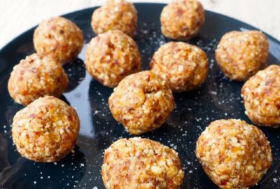 - Drain the dates and place into a food processor. Add the almond meal, coconut and cacao and process until well combined.